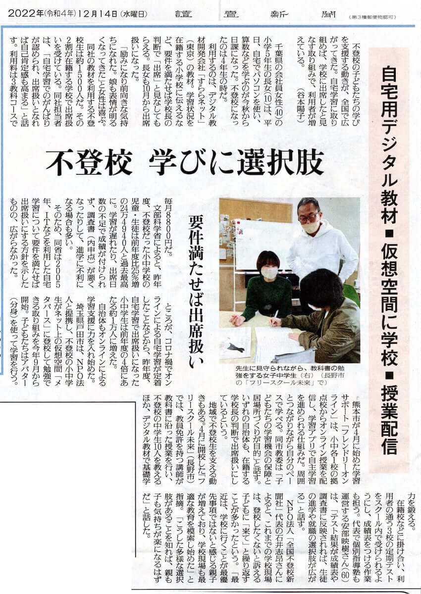 文部科学省の【登校扱い】の条件をクリアしている ICT教材を導入しています。長野県教育委員会も認定している優れた学習教材で、条件が整えば登校扱いになります。ここで学習した内容を成績認定してくれる学校も増えてきました。